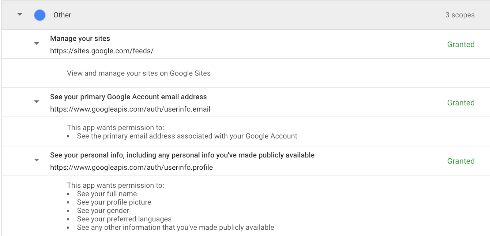 ⚠️ Note: The manage sites scope was previously required for an older Google Sites v1 integration, but this API was deprecated in September 2021.