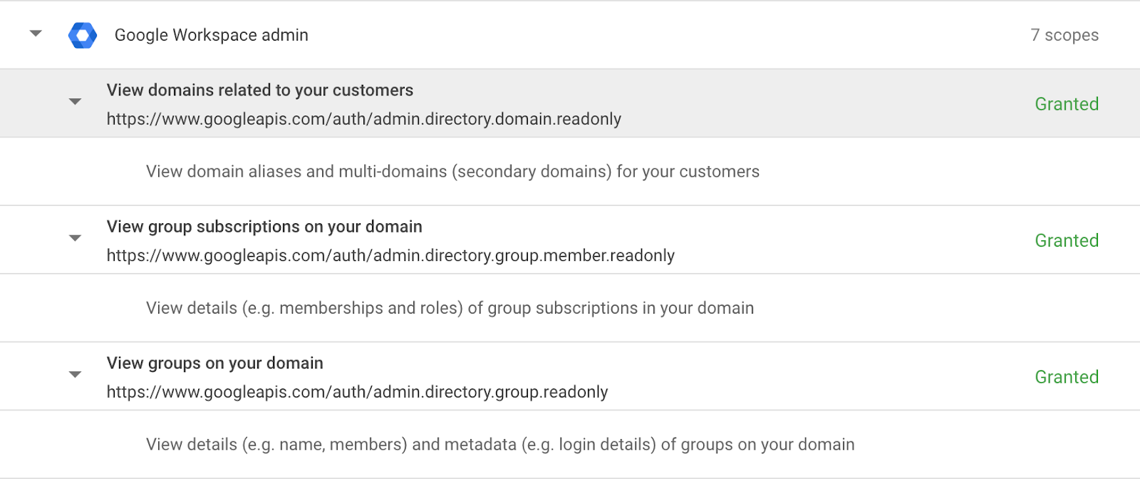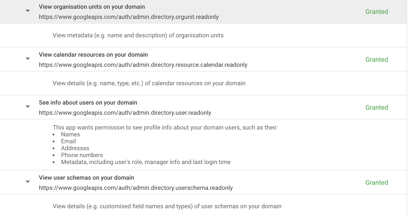 - Resource calendars read-only scope: Included by Google in the Admin SDK API.